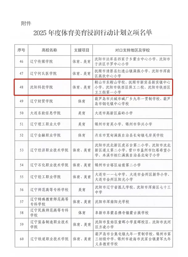 近日,辽宁省教育厅发布了《关于公布2025年度体育美育浸润行动计划立项名单的通知》,新利国际成功获批该计划立项。根据计划,学校将组织专业的体育美育教师团队,在体育美育课程教学、实践活动、校园文化建设以及教师队伍建设等方面,面向指定的中小学提供定向精准帮扶和志愿服务,充分发挥高校体育美育专业教师和相关专业学生的力量,为中小学校体育美育课程建设及相关教学活动提供有力支撑,推动中小学体育美育日常化、多样化、特色化发展。