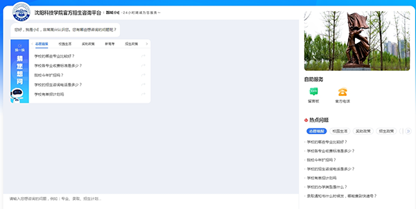 登录学校招生网站http://zhaosheng.syist.edu.cn/,可以通过右侧悬浮栏“智能问答机器人”进行在线咨询,查看学校招生简章等信息。