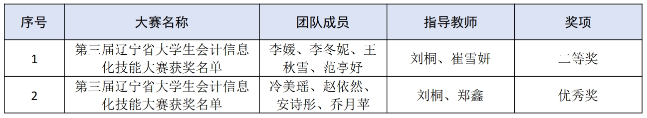 在2024年第三届辽宁省大学生会计信息化技能大赛中,获得二等奖1项、优秀奖1项。