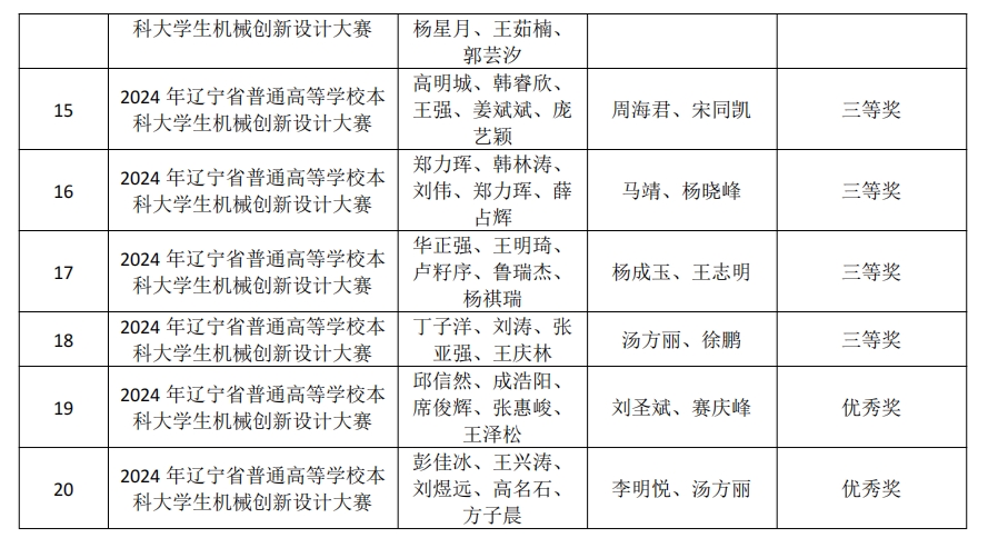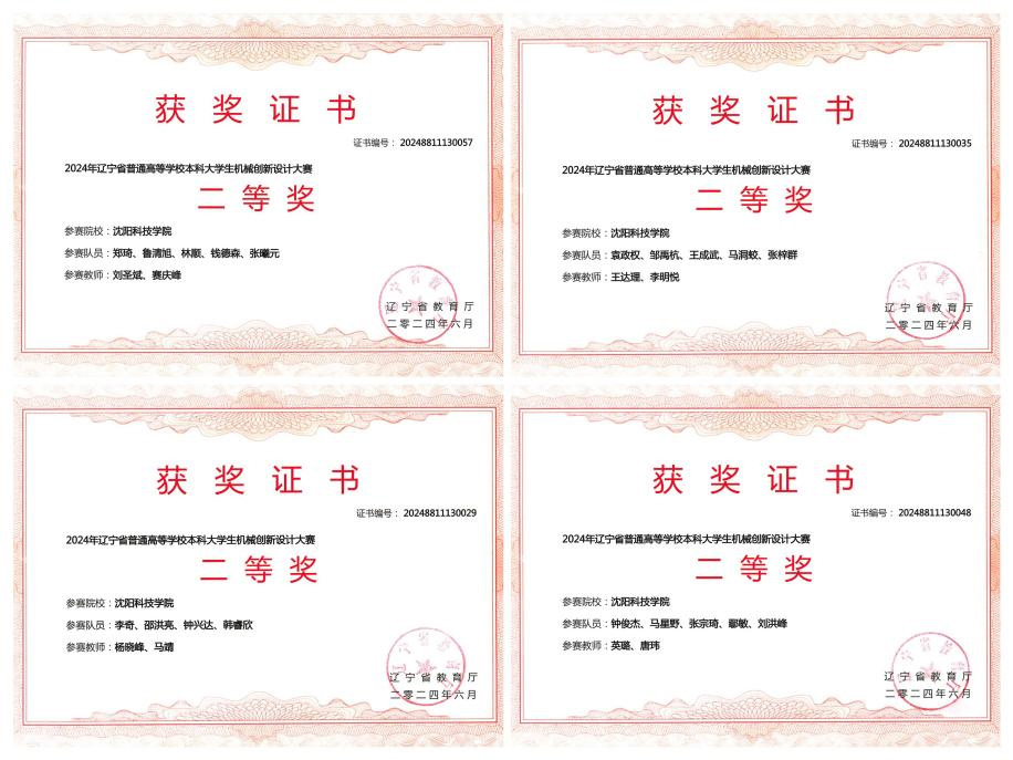 在2024年辽宁省普通高等学校本科大学生机械创新设计大赛中,获得二等奖8项、三等奖10项、优秀奖2项。
