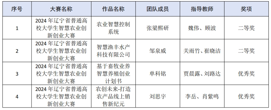 在2024年辽宁省普通高校大学生智慧农业创新创业大赛中,获得二等奖2项、优秀奖3项。
